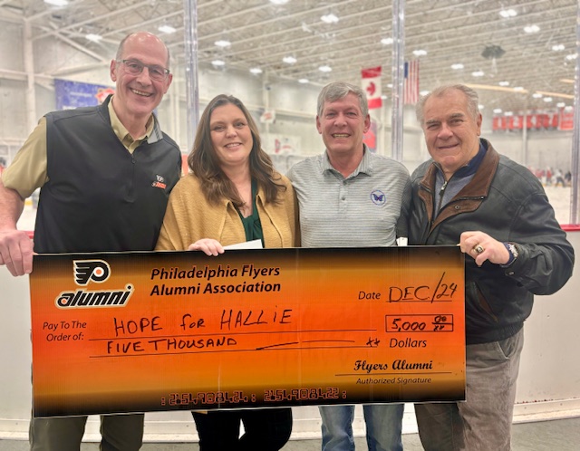 On Day 4 of the Flyers Alumni’s 2024 edition of the 12 Days of Christmas, Brad Marsh and Joe Watson presented a $5,000 donation to Hope for Hallie. Based in Swarthmore, PA, founders Kevin and Chrissie Jackson created the charity in loving memory of their daughter Hallie. The organization, much like the Do It for Daron program that Flyers Alum Luke Richardson and wife Stephanie formed in Canada in 2011 in memory of their daughter, does yeoman work to raise awareness of mental health issues, fight the related stigmas and educate the public about depression and suicide.