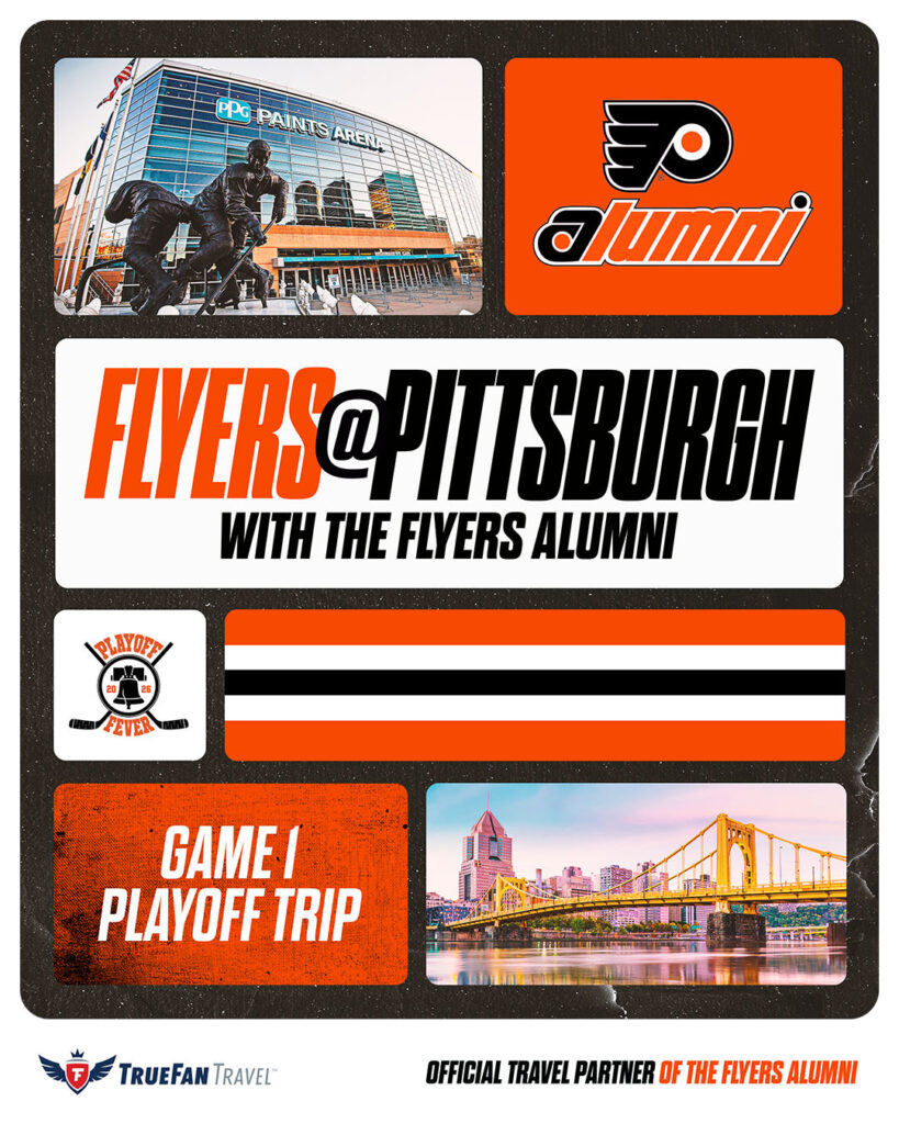 The Philadelphia Flyers are in the 2026 Stanley Cup playoffs! The Flyers Alumni would love to have YOU come along with us on the road for the True Fan Flyers Alumni Road Trip to Game 1 of the Eastern Conference Quarterfinal series between the Flyers and the Pittsburgh Penguins. We leave April 17 and return to Philadelphia on the 19th.