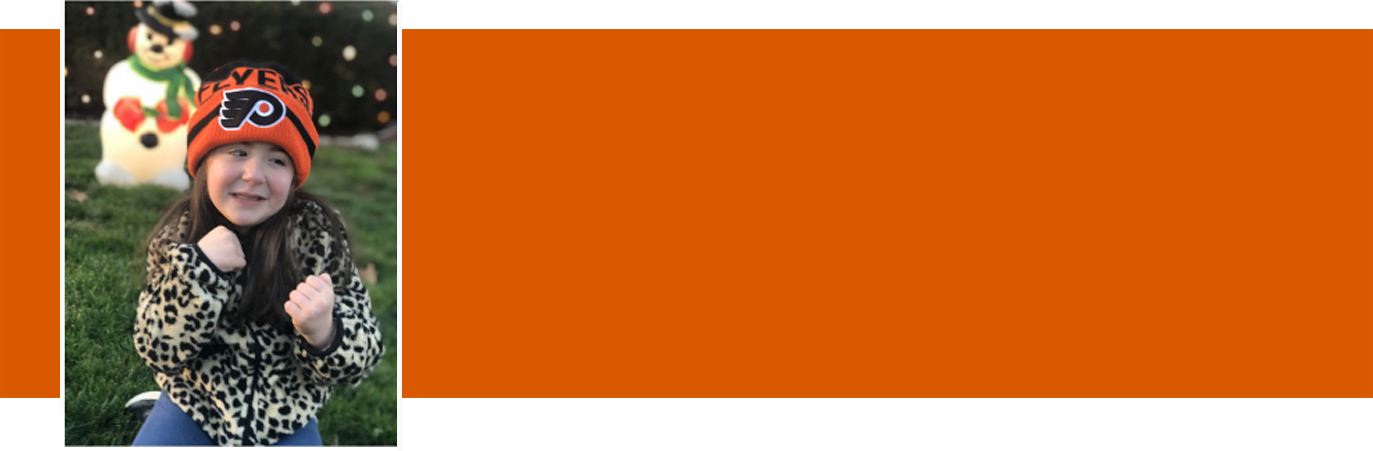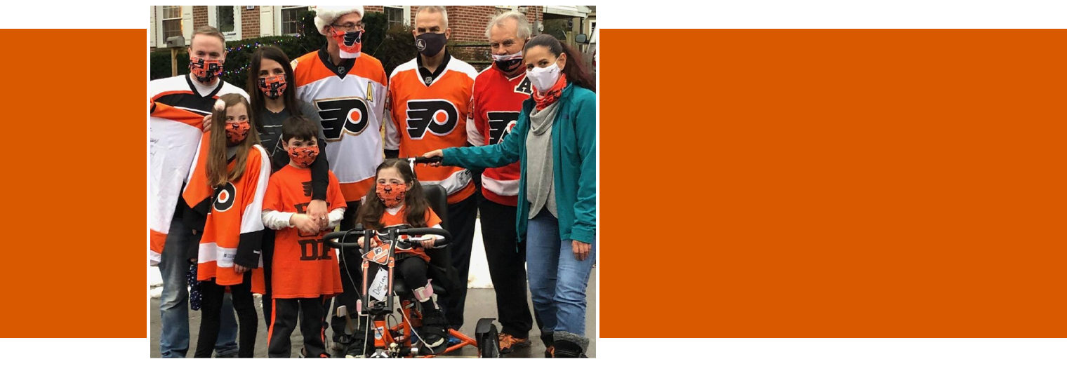 There is a high back on the bike seat, so she is supported and again doesn’t have to worry about using muscles to support her back when she is riding. It provides the right support but also great movement to use and strengthen muscles as she is having fun. The entire Brooks family — Lucy’s dad, Mike, her mom, Jaclyn, her siblings, and Lucy herself — are all big fans of the Philadelphia Flyers.