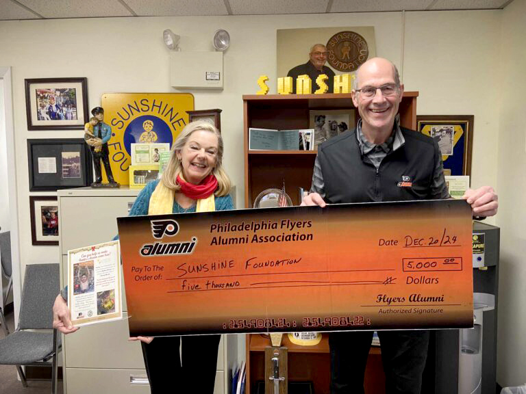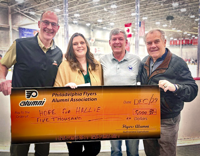 On Day 4 of the Flyers Alumni’s 2024 edition of the 12 Days of Christmas, Brad Marsh and Joe Watson presented a $5,000 donation to Hope for Hallie. Based in Swarthmore, PA, founders Kevin and Chrissie Jackson created the charity in loving memory of their daughter Hallie. The organization, much like the Do It for Daron program that Flyers Alum Luke Richardson and wife Stephanie formed in Canada in 2011 in memory of their daughter, does yeoman work to raise awareness of mental health issues, fight the related stigmas and educate the public about depression and suicide.